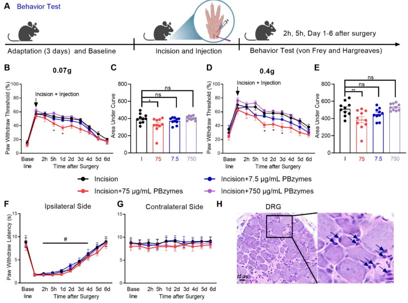基于已完成表征的 PBzymes 材料,研究者构建小鼠足底切口术后疼痛模型,通过单次外周注射不同浓度 PBzymes,评估其对术后疼痛行为的调控作用(图 3A)。von Frey 机械痛实验结果显示,75 μg/mL PBzymes 可显著、持续地缓解术后机械性痛觉超敏,在 0.07 g 与 0.4 g 两种刺激强度下均明显降低缩足频率,曲线下面积分析进一步证实该剂量具有稳定镇痛效果,效应可持续至术后 6 天(图 3B–E);7.5 μg/mL 与 750 μg/mL PBzymes 未产生显著镇痛作用,整体呈钟形剂量–效应关系。激光热痛实验显示,PBzymes 未改变热痛觉过敏表型,提示其镇痛作用具有机械痛模态选择性,不影响热痛传导(图 3F–G)。伊红染色结果显示,PBzymes 可经坐骨神经转运并富集于 DRG 区域,为其靶向 DRG 发挥作用提供了组织学依据(图 3H)。