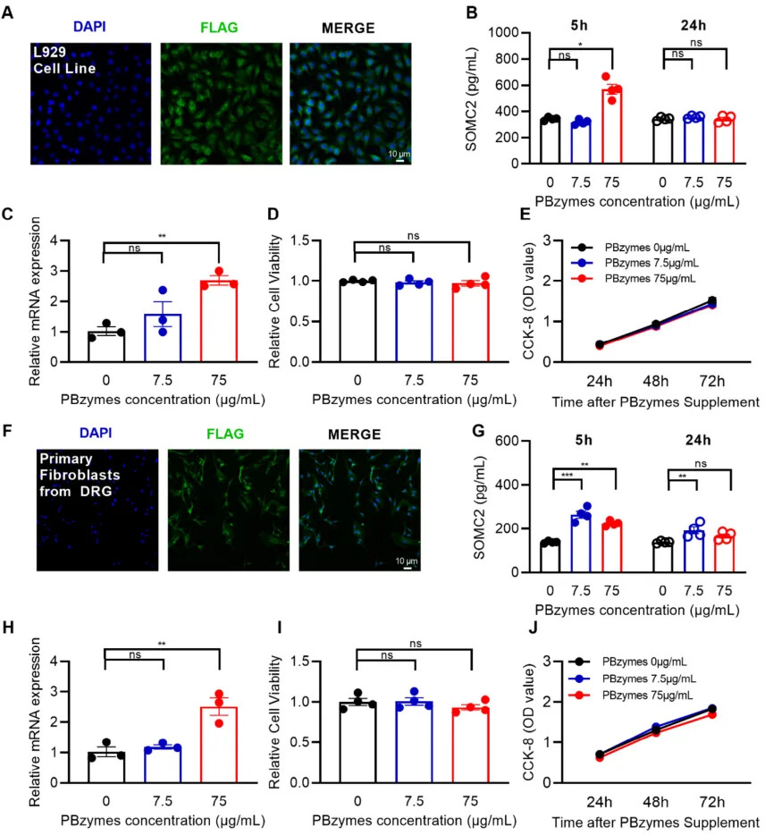 考虑到 SMOC2 为分泌型蛋白,研究进一步在 L929 成纤维细胞系与原代 DRG 成纤维细胞中验证 PBzymes 对 SMOC2 分泌的调控作用(图 7A, F)。结果显示,PBzymes 处理可显著提高两类细胞的 SMOC2 分泌水平,并上调 Smoc2 mRNA 表达,提示 PBzymes 可直接促进 SMOC2 合成与分泌(图 7B–C, G–H)。CCK‑8 检测证实,75 μg/mL PBzymes 不影响细胞活力与增殖,无明显细胞毒性(图 7D–E, I–J)。上述结果表明,PBzymes 可直接、安全地调控成纤维细胞分泌 SMOC2。